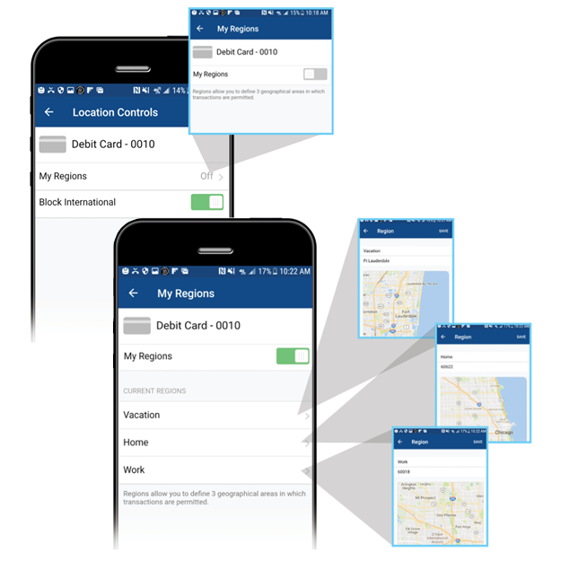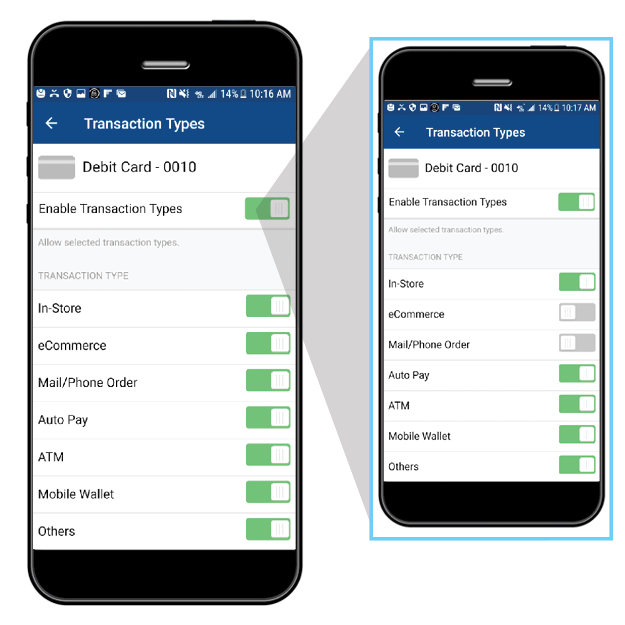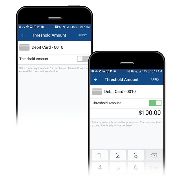 Control when, where and how your debit card can be used. Turn card On/Off | Set Purchase Limits | Control Transaction & Merchant Types | Designate Use by Geographic Locations.